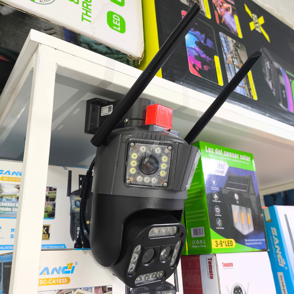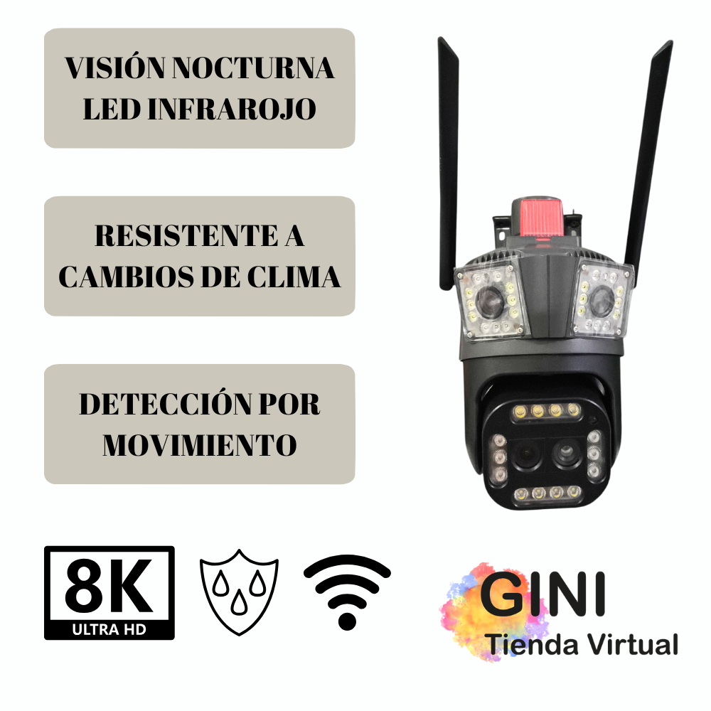 La cámara de seguridad es un dispositivo de vigilancia para exteriores de alta gama con múltiples lentes (4x2MP) y resolución 8MP/4K. Cuenta con zoom motorizado 10x, movimiento PTZ de 350°, visión nocturna a color, seguimiento inteligente, alarma con luces y almacenamiento local/nube.